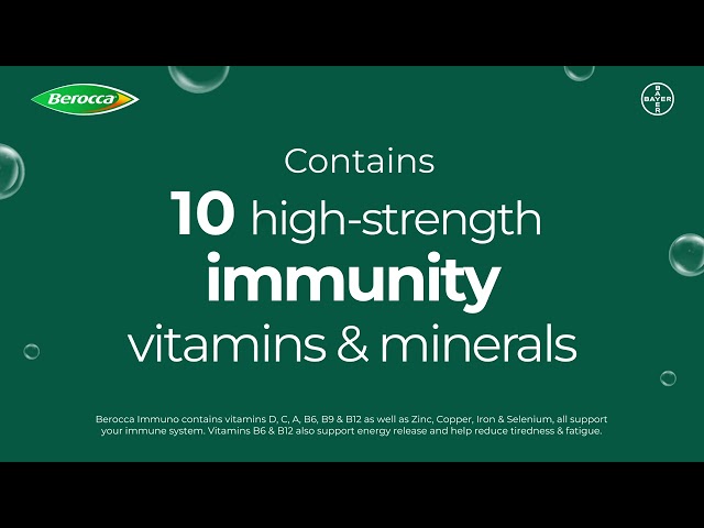 - Berocca Immuno is packed with 11 vitamins and minerals including high-strength vitamin C, vitamins D, A, B6, B9 & B12 as well as Zinc, Copper, Iron & Selenium, which all support your immune system – your body’s natural defender.
